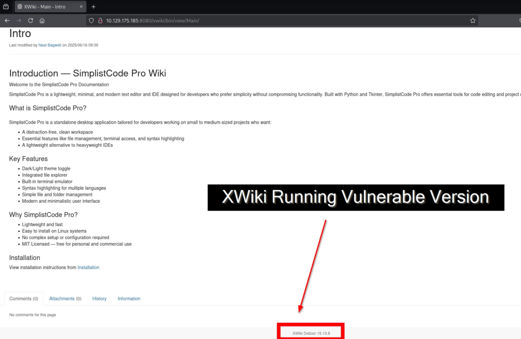 The vulnerable target is an XWiki instance running version 15.10.8, which is affected by CVE-2025-24893.