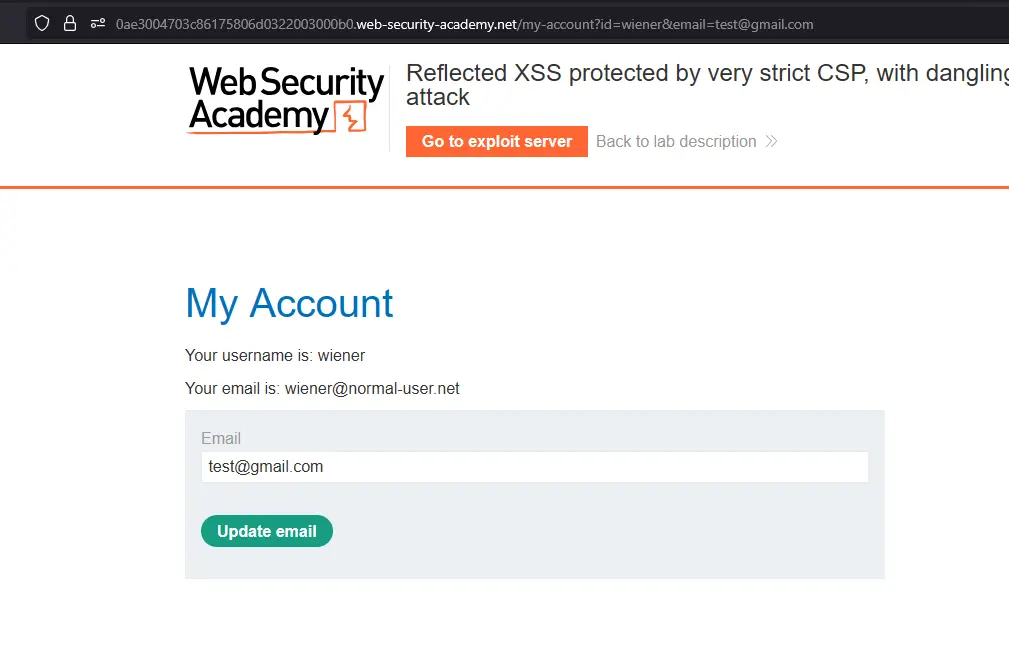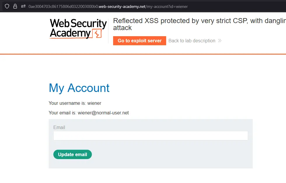 To solve the lab, perform a form hijacking attack that bypasses the CSP, exfiltrates the simulated victim user’s CSRF token, and uses it to authorize changing the email to [email protected].